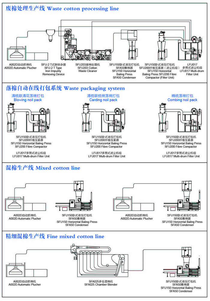 專業生產SFA系列開清棉設備(包括老機改造)、SFU廢棉處理機系統設備、紡織除塵設備、及粗紗頭開松機、立式臥式液壓打包